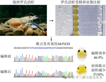 利用該系統(tǒng),團(tuán)隊(duì)成功編輯了眼發(fā)育基因MrPAX6和性相關(guān)基因MrIAG。使注射后的胚胎發(fā)育成活率、幼體孵化率得到了顯著提升。
